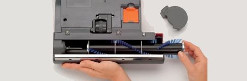 Simply push a button and the brush roller can be taken out, cleaned or exchanged with ease – no tools required. The orange trap door underneath can be accessed for blockage removal reducing vacuum down time.